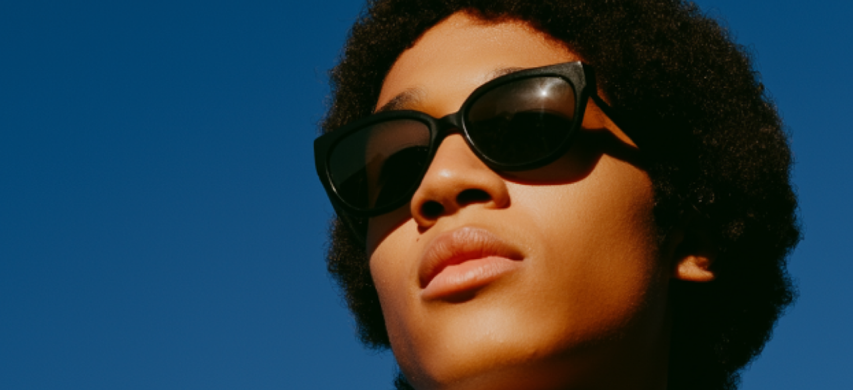 Side profile of a person with curly hair against a gradient background of red and purple hues.